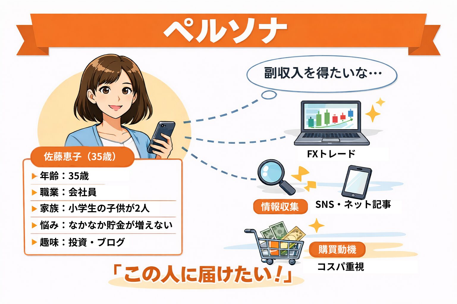 たとえば、冒頭に書いた「新NISAに積み立てるための5万円」を投資や投機で作る人をメインターゲットに絞る簡単な方法はペルソナを作ること。