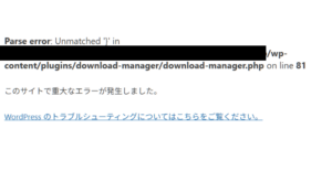 例えばこのようなエラーの場合、download-managerプラグインが原因なので、該当プラグインを外せば復旧するのですが、管理画面にアクセスできない状態ですので、FTPで強制的に該当プラグインを外して対応します。